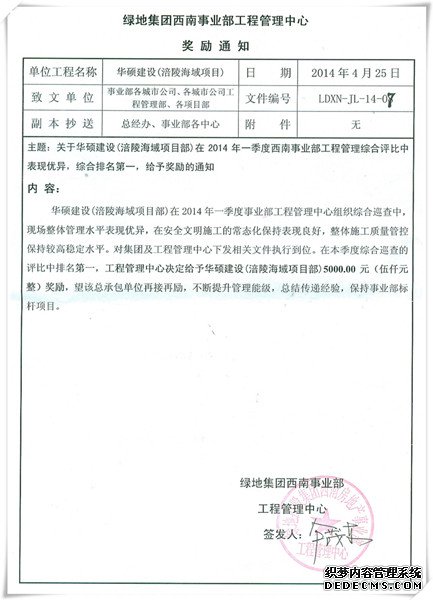 公司涪陵绿地海域项目部,在绿地集团西南事业部2014年一季度工程条线检查交流综合评比中表现优异,荣获综合排名第一。本次检查,我公司涪陵绿地海域项目被安排在4月25日进行。当日,西南事业部一行20余人抵达涪陵绿地海域、澜屿项目,对该项目外部形象、办公区环境、现场安全文明施工、实体质量等进行了详细检查。通过检查,海域项目各项评分均居前列,以绝对优势赢得综合评比第一名。