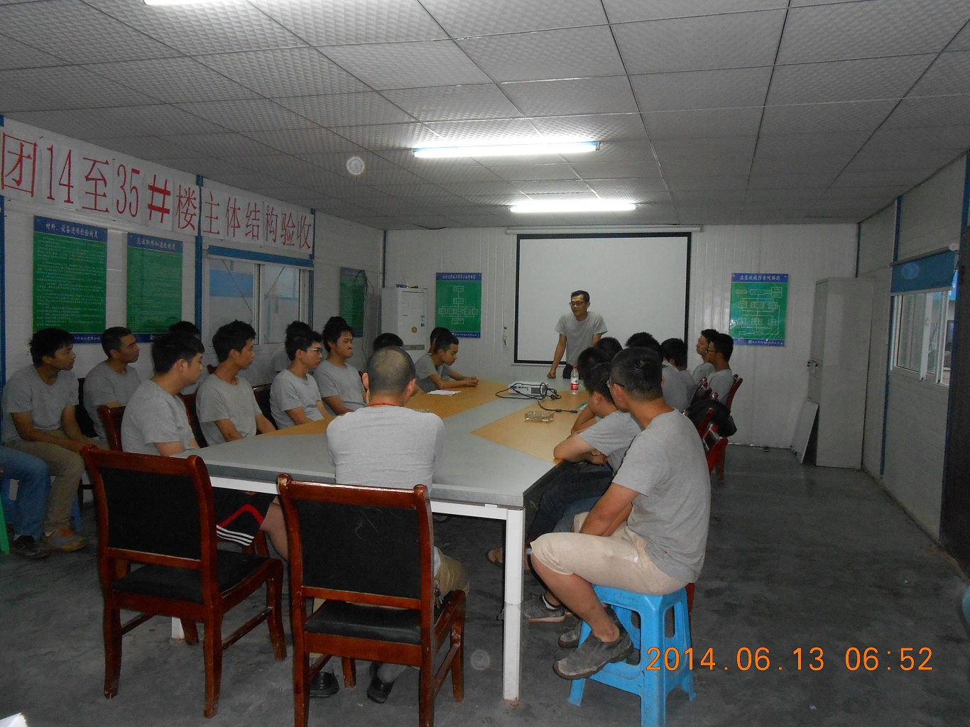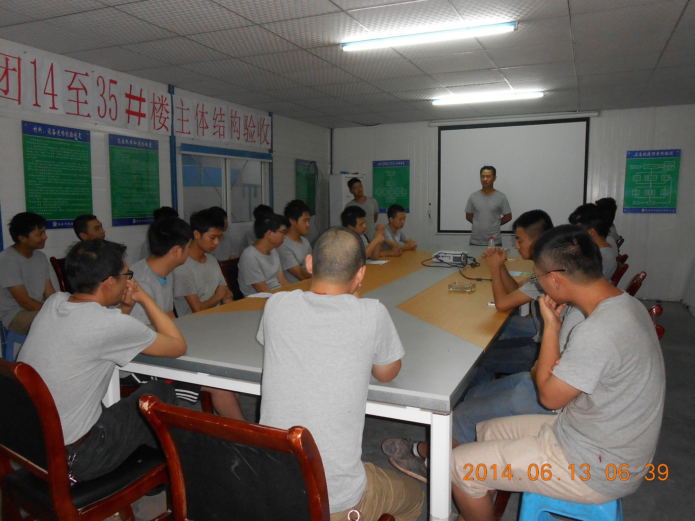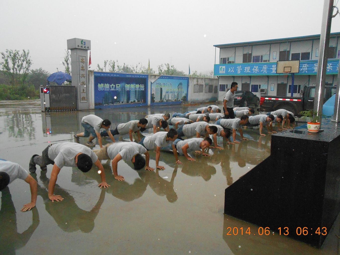 2014年6月13日,公司融创照母山项为期一月的军训活动圆满结束,效果显著!同时,项目召开了军训总结会。会上,队长任超首先承认自己的短板,并甘愿受罚做200个俯卧撑;接着分享了这一个月他内心最大的感受——“用心”,用心做好每一件事情,相信一定会有好的结果!正如“世上无难事,只怕有心人”。副队长曹金华表示甘愿和队长一同受罚,并表示非常感谢兄弟们坚持到最后,每个人都或多或少有所收获,也都养成了良好的工作习惯,每天梳理工作内容和计划,希望兄弟们能把习惯持续下去,努力做好每一件事。项目施工负责人余世宗对军训能取得圆满成功感到很欣慰,并对表现突出的质检员丁囿铭、罗波,施工员刘庄、成渝、高大江等人员给予表扬,希望每个人把这股冲劲持续下去,通过军训过程,努力学习,学会用心做事,用心接纳意见和建议,吸收长处。项目经理袁摈指出建筑行业贵在坚持,希望员工能找到方向,为以后的职业生涯打好坚实基础。同时他强调进入6月份项目工作内容很繁重,希望每个人都鼓起劲,加油干,坚持到底!接着,队长任超和副队长兑现军训承诺——200个俯卧撑。此时,项目全体管理人员冒着大雨纷纷跟着他们一起受罚,团结一心令人感动!