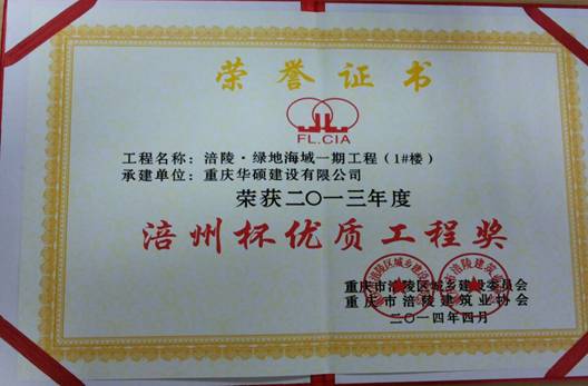 2014年6月13日下午,“2013年度涪陵区建筑业表彰大会”在涪陵区三机关101会议室隆重召开。会上,公司承建的绿地海域一期工程1#楼荣获“涪州怀优质工程奖”,受到表彰。该奖项的获得经过了项目自主申报、专家现场检查、复查及评审委员会评审、公示多个环节,荣誉不易,每一份都有华硕人的辛勤付出,希望公司所有项目持续努力,保证品质,争先创优,推动华硕建设成为行业翘楚!