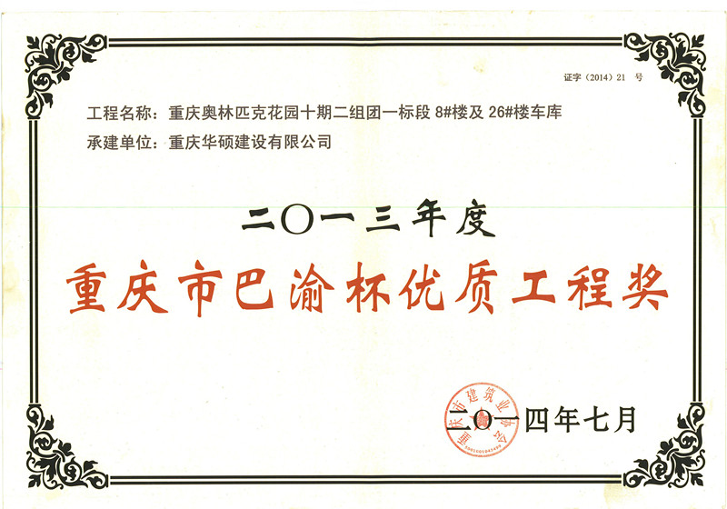 日前,“2013年度重庆市巴渝杯优质工程奖”表彰会在重庆市北部新区维景国际大酒店隆重召开,工程部经理廖胜代表公司参加会议.表彰大会上,我公司奥林匹克花园十期8号楼荣获“2013年度重庆市巴渝杯优质工程奖”。奥林匹克花园十期8号楼共40层,属超高层建筑。自开建以来公司就以标杆工程要求,在公司严格的管理和该项目员工的共同协作下,于2013年7月荣获“2012年度重庆市三峡杯优质结构工程奖”,同年12月份在保证工期、质量的同时全面竣工。本次获“巴渝杯”奖更是对该项目实体质量的高度肯定,同时也是对我公司工程管理水平的高度认可。希望各项目严格执行公司CI和工法标准,有更多工程获奖,共同为公司工程质量和管理水平提升做出更大贡献,在公司跻身行业一流的同时为公司提升业界口碑创造更有利条件。