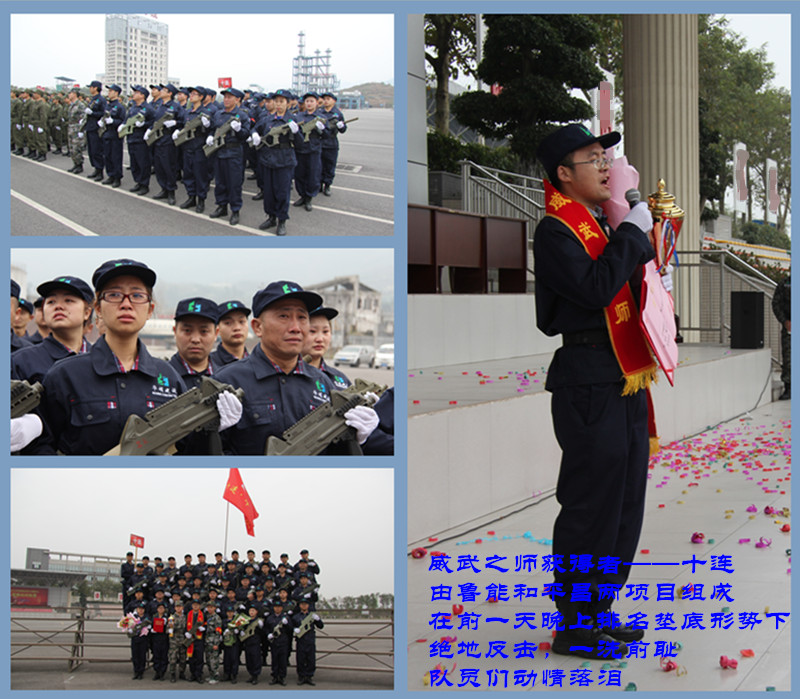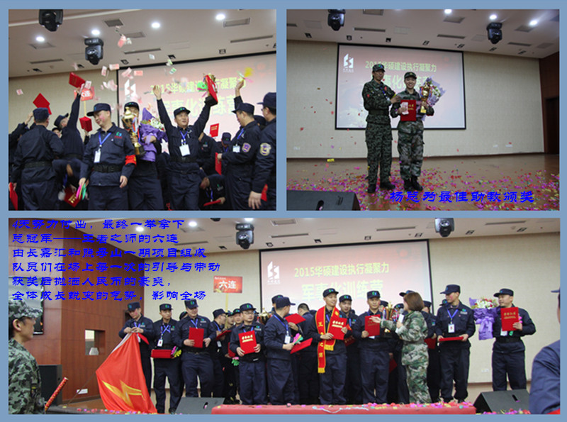 重庆华硕建设有限公司为期四天的“2015年执行凝聚力军事化训练”,经过前期各部门、项目的紧张筹备,于2015年2月28日正式开营,500多名华硕儿女全体参训。这是一个什么样的团队?这是一支什么样尖兵?当别人还在享受春节欢愉,他们早在部队洗礼!当别人深夜早已休息进入梦乡,他们仍在奋战!这就是华硕儿女!!!百炼成钢绕指柔,千刀万剐落地佛。为成长蜕变,为成才成将,28日上午10时30分,华硕建设500将士,十个连队,准时在作训基地集合会师,全体备战,无论是队名、队呼士气,还是稍息、立正训练,各连队将士精神抖擞、士气高涨,为本次全员军训云程发韧,开了好头!28日晚10点,第一天课程圆满结束,引爆全员。华硕全体将士经历雪雨训练,依然士气高昂,一呼百应,全体投入,积极学习。10个连队各自分享学习收获持续至凌晨,信任、纪律、习惯……坚守作风。3月1号,训练第二天,已是晚上十一点,团队仍然亢奋剖析案例。从清晨6点到凌晨2点,全体将士上课、训练、吃饭、分享紧张进行,所有人不惧疲劳,不畏时间,坚持到底,秉持作风,铭记文化,期待蜕变!三连凭借出色的表现记得第一个日冠军。3月2日晚上,对所有华硕人注定又是一个不眠之夜。军训第三天,全体将士全力奋战,为拿下当天的日冠军努力,为最后一天的总冠军冲刺,更为拿下自己的不足与失败。经过上午紧张训练,下午全体激情更盛,投入课程和各部门剥皮会,直面缺点。有人被剥的全身冷汗,有人被剥的痛哭流涕,有人被剥的抬不起头……感受深入骨髓。晚上各部门(项目)负责人总结分享并制定改进措施,决心在2015年带好团队,为自己和兄弟、企业拿下成果!!三天比拼,十个连队,垫底的五连、十连、二连连长在台上手捧破碗和脏馒头,痛哭不已,但他们没有放弃,连长没有,队友没有,他们依然铿锵有力,准备在最后一天用百分之百的投入赢得总冠军,一洗前耻!华硕建设大家长、华硕商学院精神领袖袁总,用无比坚毅和坚定的发言,激昂指点华硕儿女,乾坤再铸华硕江山!!!3月3日,军训最后一天。上午大阅兵,袁总对华硕儿女4天的训练成果进行检阅,全体将士精神抖擞,斗志昂扬,展示了华硕儿女激情和士气。第三天晚上排名垫底端破碗的十连(由鲁能和平昌两项目组成),经历低谷和耻辱,但依然不言败、不服输、不放弃,他们绝地反击,阅兵时以形神兼统、响彻云霄的士气,震撼评委,一举拿下威武之师。下午承诺誓师,奥园15期全体员工承诺时展示的骨气和一洗前耻的决心,令全场动容,获得全场最高分。 内江项目尤其项目经理曾伟不惧挑战的血性令全场佩服。最终,经过四天三夜的艰苦奋斗,由长嘉汇和照母山一期两个项目组成的六连一举夺得总冠军——王者之师!他们站在台上,荣耀无比。他们赢得第二天的日冠军,他们抛洒人民币时的豪气,夺得冠军的兴奋与激动令全场艳羡,他们为夺得冠军四天来所付出的努力令全场折服。2015年注定是华硕建设的不凡之年,2015春天的华硕建设朝气蓬勃、激情似火,华硕500儿女在一起度过终身难忘的四天。四天,他们同场比拼;四天,他们打开心门,接近距离;四天,他们共同成长蜕变;四天,华硕建设组织再造,锻造团队,再铸军魂!!!3月3日下午17点,华硕建设2015年军事化训练活动圆满落幕,同时感谢汇聚李程老师的全情付出及重庆分公司全体同仁的鼎力相助!未来华硕人必将再拓疆土,再铸辉煌!!