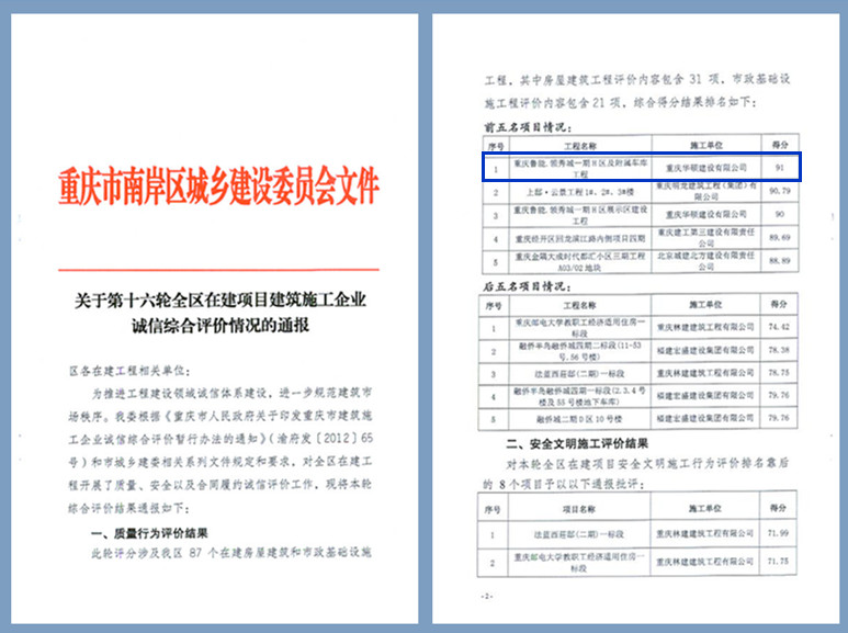 南岸区“第十六轮全区在建项目建设施工企业诚信综合评价情况”日前揭晓,我公司鲁能领秀城项目获得质量行为评价第一。该评价是评价组依据《重庆市建筑施工企业诚信综合评价暂行办法》和市城乡建设相关系列文件规定和要求,多次对现场质量抽查、安全隐患排查、合同签订检查打分,经南岸区建委综合评定的结果。我公司鲁能领秀城以过硬的工程质量、执行到位的工法标准和严格的现场管理,最终取得质量第一,这是对该项目全体员工努力付出的最好嘉奖,也是对我公司工程质量的肯定。相信我公司所有在建项目会始终坚持“质量为本诚信务实 安全至上 协作创新”的企业宗旨,拿出出更多高水平、高质量的工程,延续“品质 建筑 生活”的企业使命,实现“建筑 中国 样板”的企业愿景!