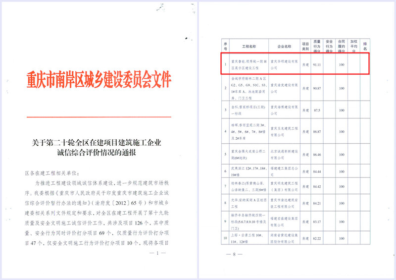 2015年12月3日,南岸区“第二十轮全区在建项目建设施工企业诚信综合评价情况”揭晓,我公司鲁能领秀城3#地块项目凭借夯实的工程质量、严格的工法标准,再度蝉联质量行为评价第一。