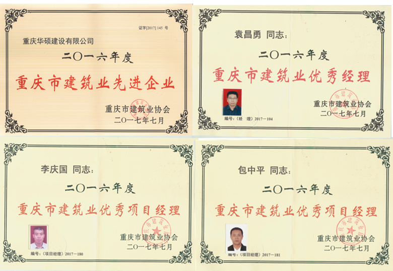 表彰大会上,我公司荣获“2016年度重庆市建筑业先进企业”称号,总经理袁昌勇同志荣获“2016年度重庆市建筑行业优秀经理”称号;包中平同志、李庆国同志分别荣获“2016年度重庆市建筑行业优秀项目经理”称号。