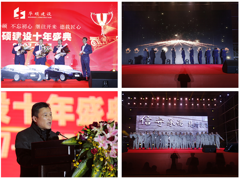 十年感恩荧幕上“华硕,我想对你说”的微电影,华硕人用最朴实的语言,道出心中最真挚的情感,头狼不易,感谢袁总让我们汇聚在一起;身为建筑人,走南闯北,征战四方,建功立业的背后是多少华硕家人默默支持与成全,感恩相守相依,感谢一生有你;承蒙昔日巧指引,今日“跪羊以报恩”,带上心意敬恩师,承蒙知遇犹不迟。最后杨总与袁总那一记拥抱,道出多年亦师亦友情!十年传承展望十年,再拓版图。针对未来发展,袁总总结经验,布局战略,作的发展报告慷慨激昂,振奋人心,让华硕人看到了新航向,新希望。随后优秀的管理层集体宣誓,誓死追随华硕,与华硕共存亡。华硕十年,军魂传承,华硕铁军集体上台附唱《华硕当自强》,男儿当自强,华硕当自强!