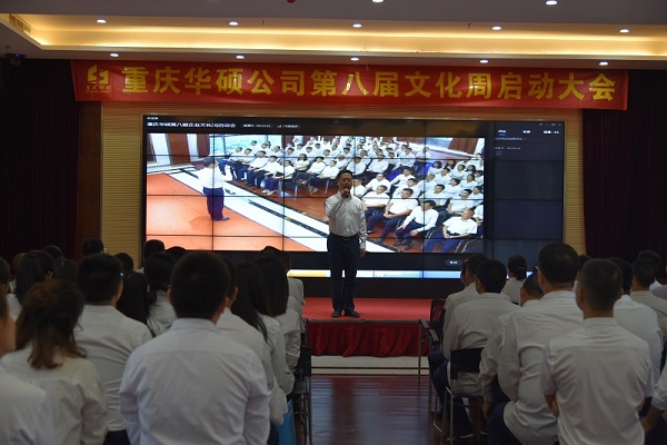 会议伊始,华硕全员起立高诵企业文化。战略副总裁林家鹤铿锵宣布:重庆华硕第八届文化周活动正式启动!执行总裁杨宏全对本届文化周主题、目的进行强调,对活动安排予以介绍。
